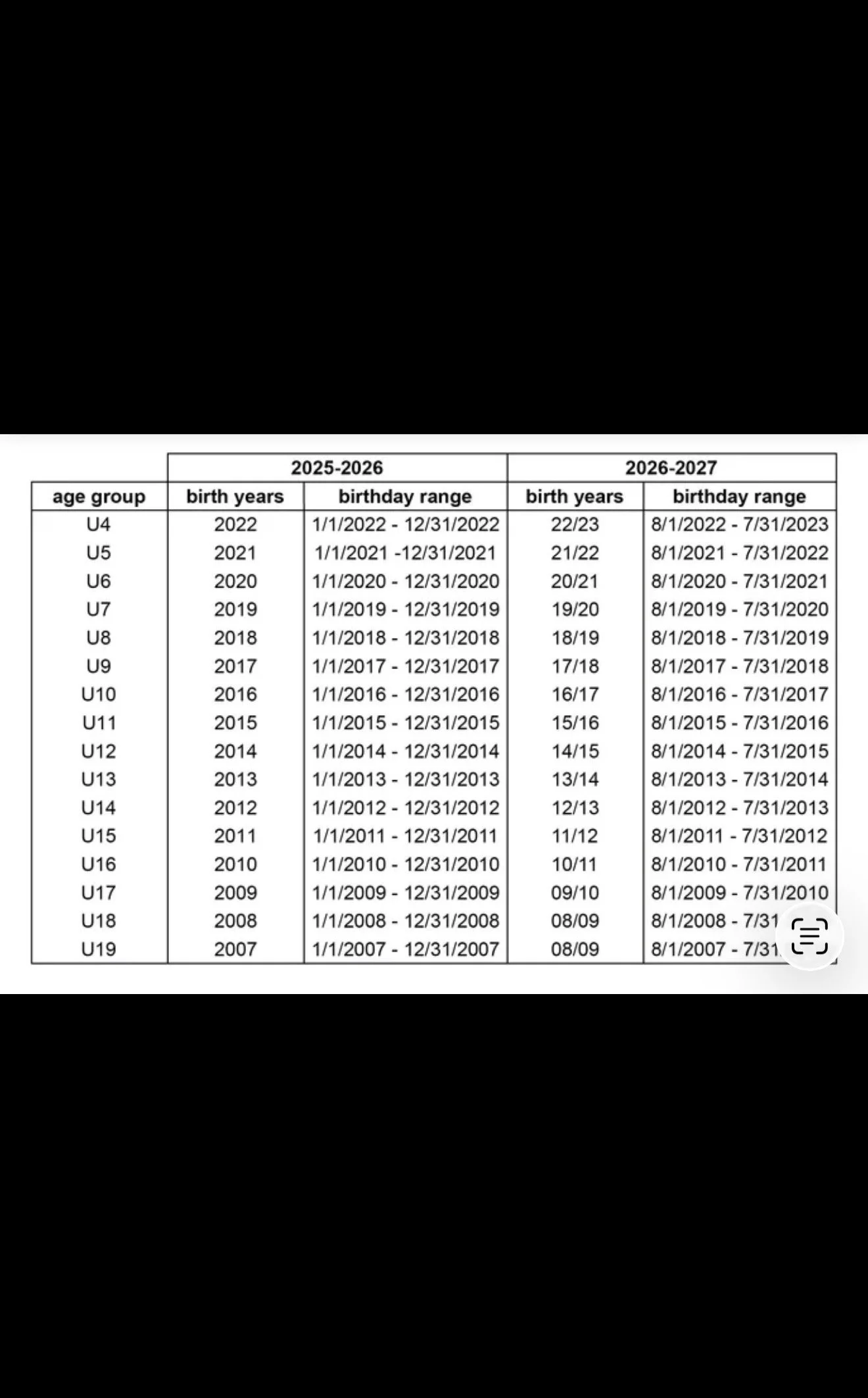 Use the matrix below to determine which age group your team should be registered in based on the oldest player's date of birth.